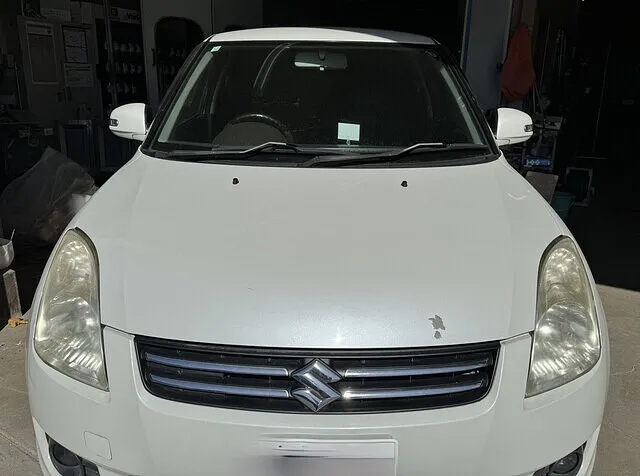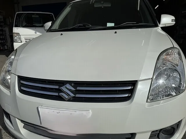 工場の朝、スイフトが静かにピットインしています。ボンネットを開けて作業が始まると、