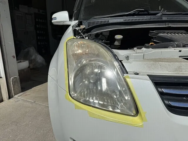 職人たちの手際よい動きが目を引きます。ヘッドライト周りには丁寧にマスキングテープが施され、